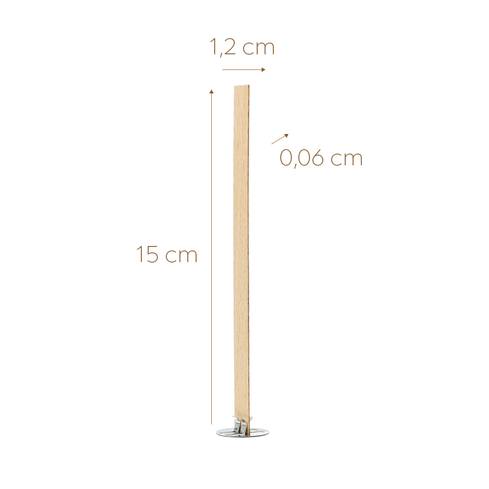 Drewniane knoty do świec wykonane z wysokiej jakości drewna bukowego. Polski produkt, pakowany w ekologiczne opakowanie papierowe. Knoty nie posiadają metalowych podstawek – idealne do świec w pojemnikach oraz formach.