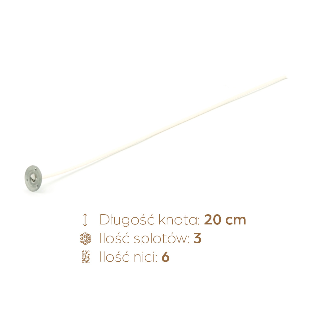 Naturalne bawełniane knoty powlekane, zaimpregnowane na całej długości, z metalową blaszką 15 mm do stabilnego montażu. Zestaw zawiera 10 szt. o długości 20 cm – gotowe do użycia, bez dodatkowej obróbki czy nasączania.