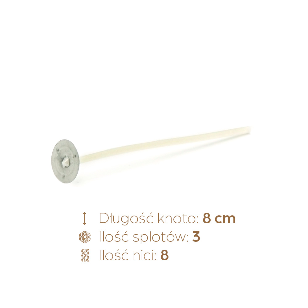 Naturalne bawełniane knoty powlekane, zaimpregnowane na całej długości, z metalową blaszką 15 mm do stabilnego montażu. Zestaw zawiera 10 szt. o długości 8 cm – gotowe do użycia, bez dodatkowej obróbki czy nasączania.