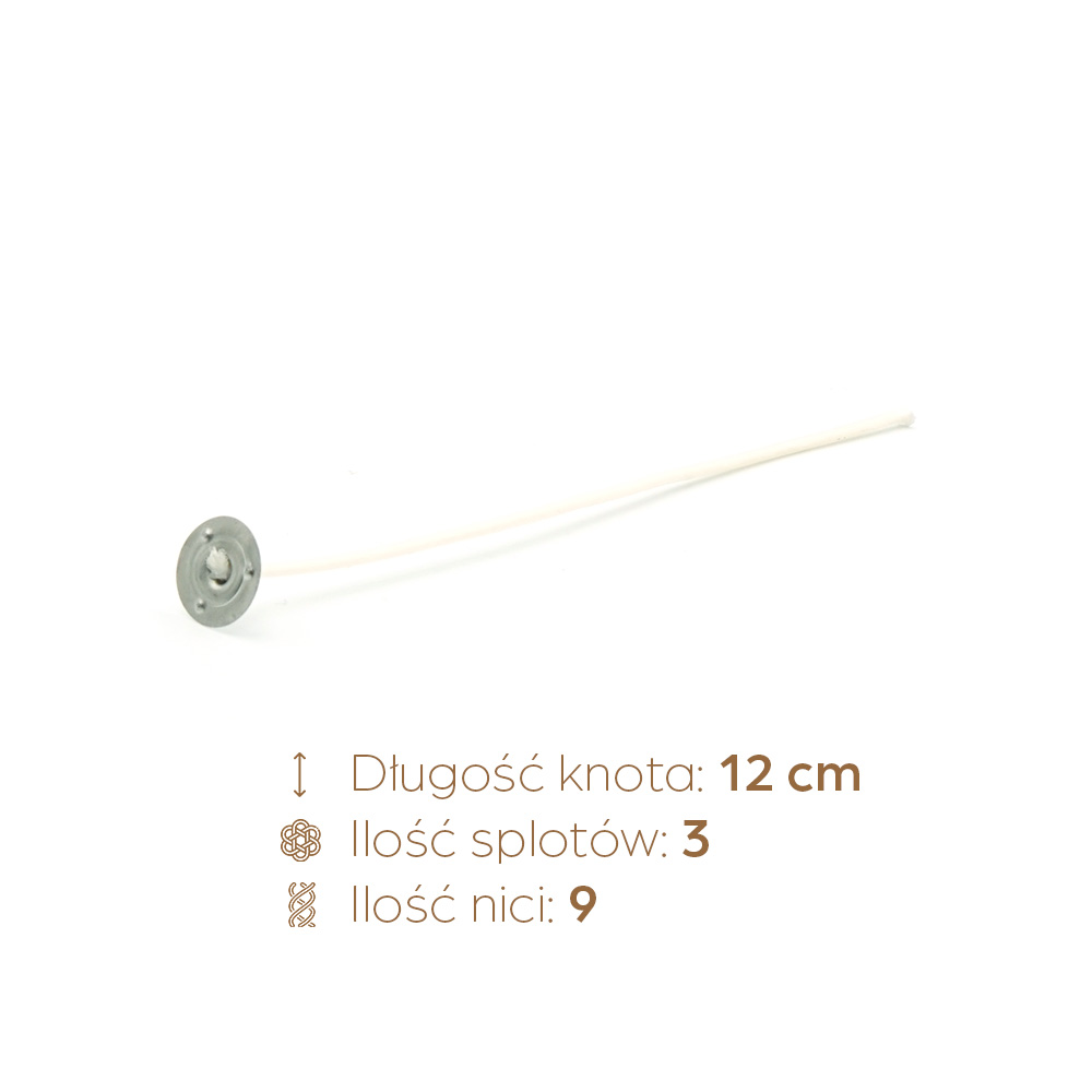 Naturalne bawełniane knoty powlekane, zaimpregnowane na całej długości, z metalową blaszką 15 mm do stabilnego montażu. Zestaw zawiera 100 szt. o długości 12 cm – gotowe do użycia, bez dodatkowej obróbki czy nasączania.