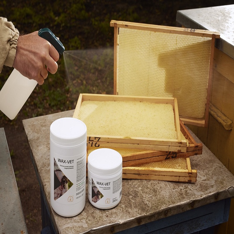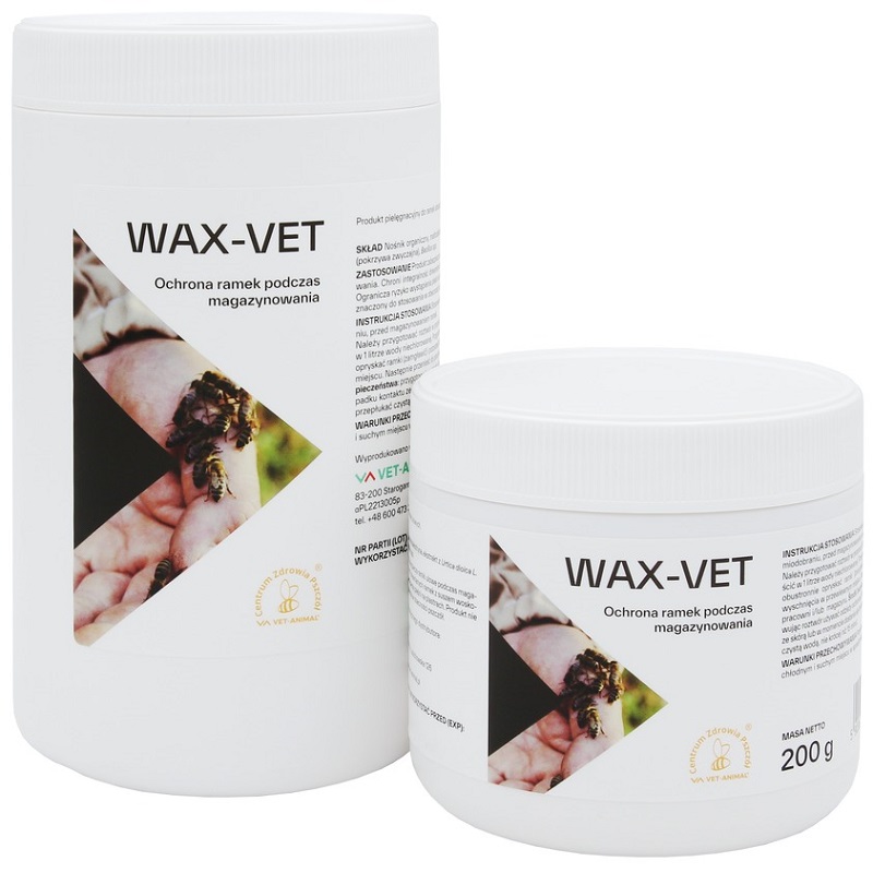 Należy przygotować roztwór w proporcji: 100 g WAX-VET rozpuścić w 1 litrze wody niechlorowanej. Przygotowanym roztworem obustronnie opryskać ramki (zamgławić) i pozostawić do wyschnięcia w przewiewnym miejscu. Następnie przenieść do pracowni i/lub magazynu.