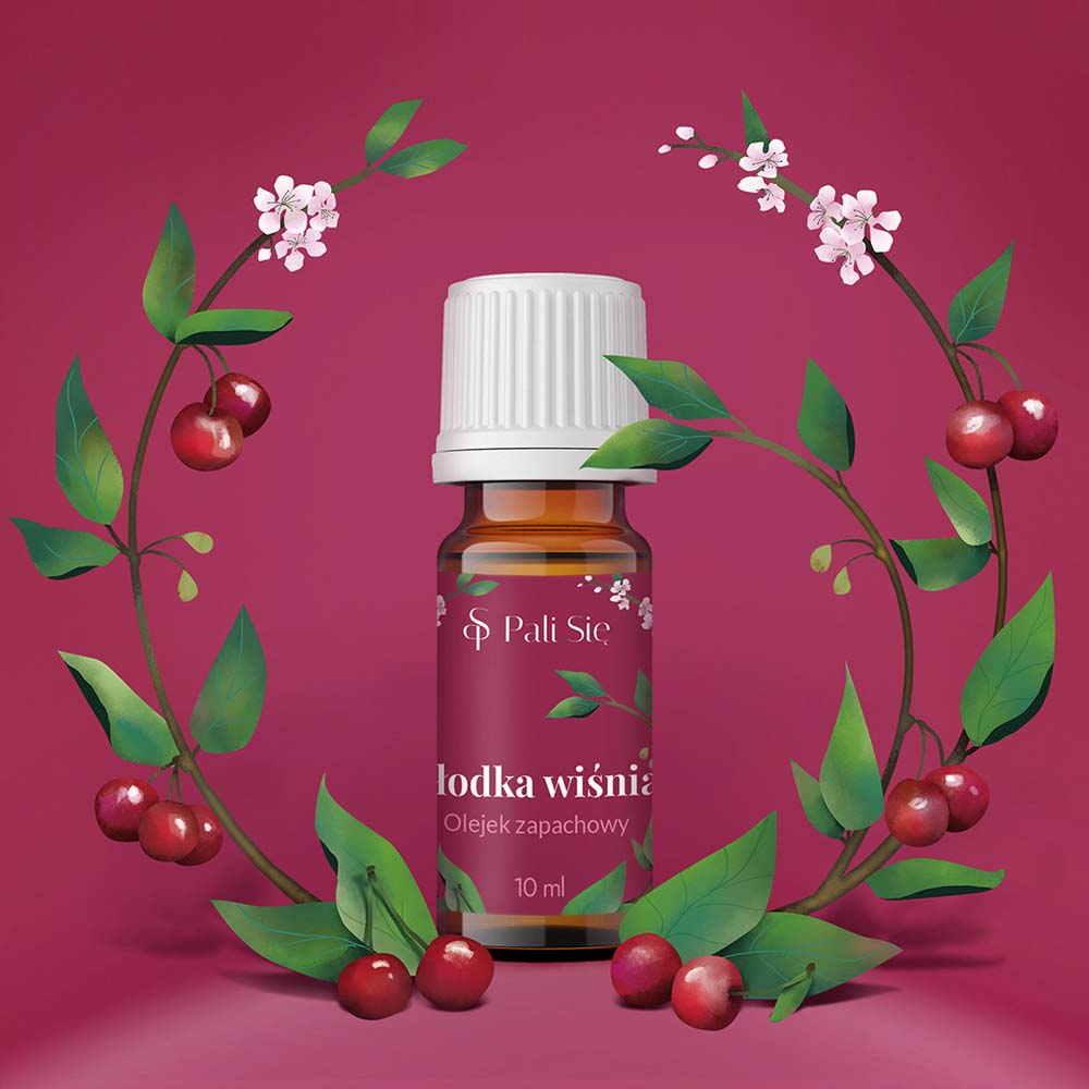 Olejek Słodka Wiśnia to radosna, soczyście owocowa kompozycja, w której intensywna słodycz wiśni i truskawek spotyka się z nutą zielonej świeżości i miękkim, waniliowym wykończeniem – idealna dla miłośników słodkich, energetyzujących aromatów.